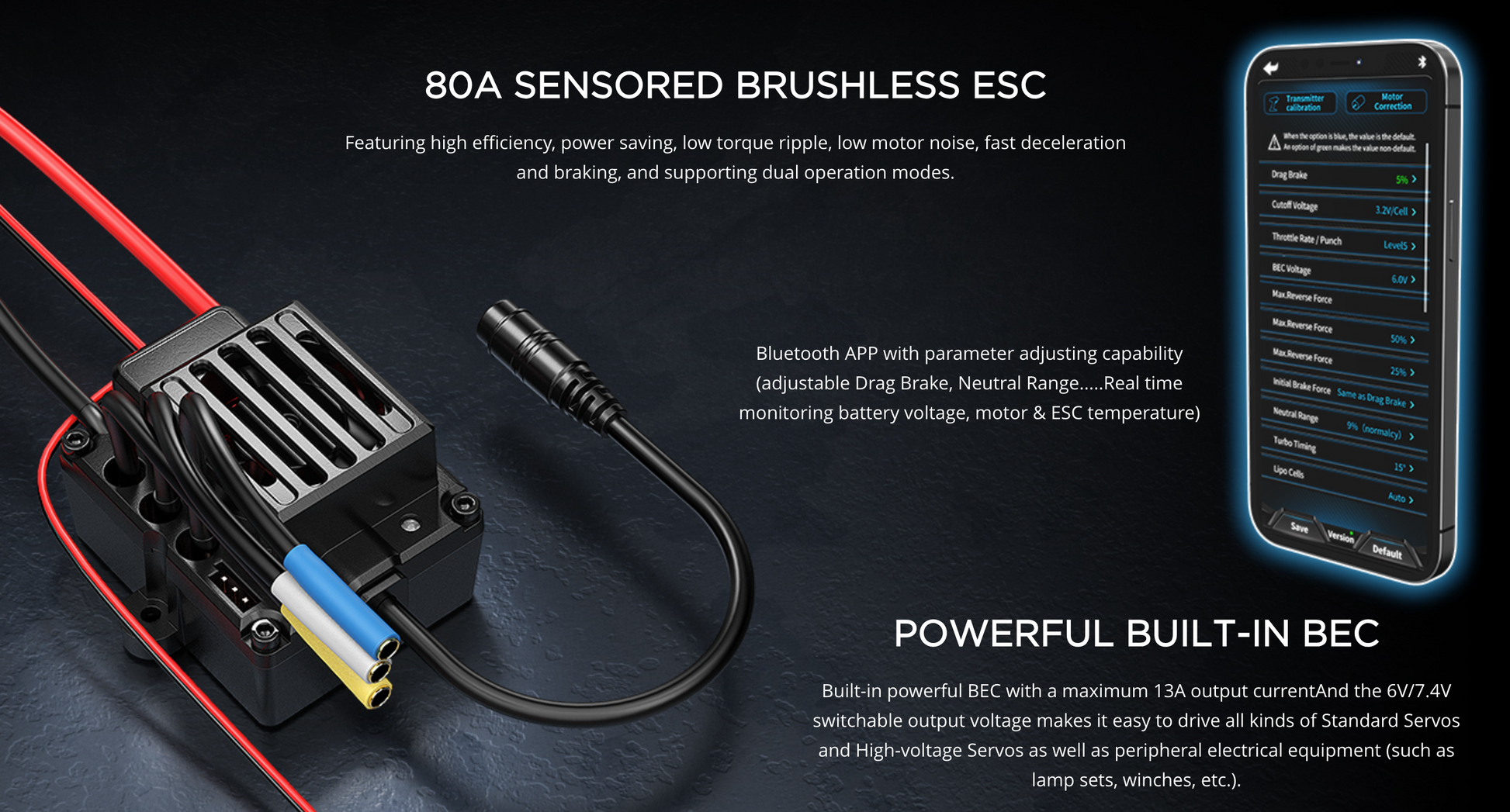 - 80A sensored brushless ESC with Bluetooth smartphone app tuning