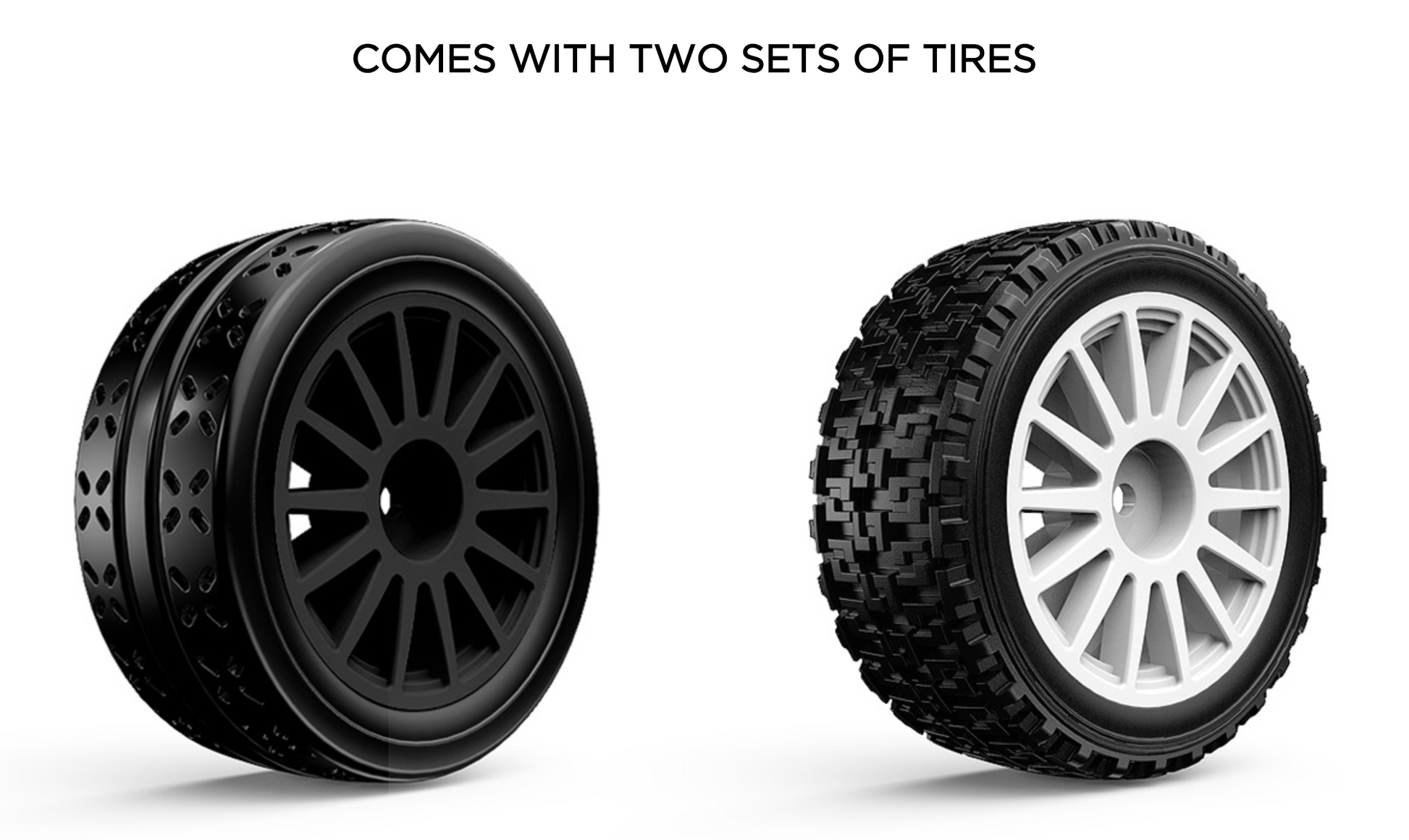 - Large rally tyres and 257mm wheelbase for incredible grip and handling