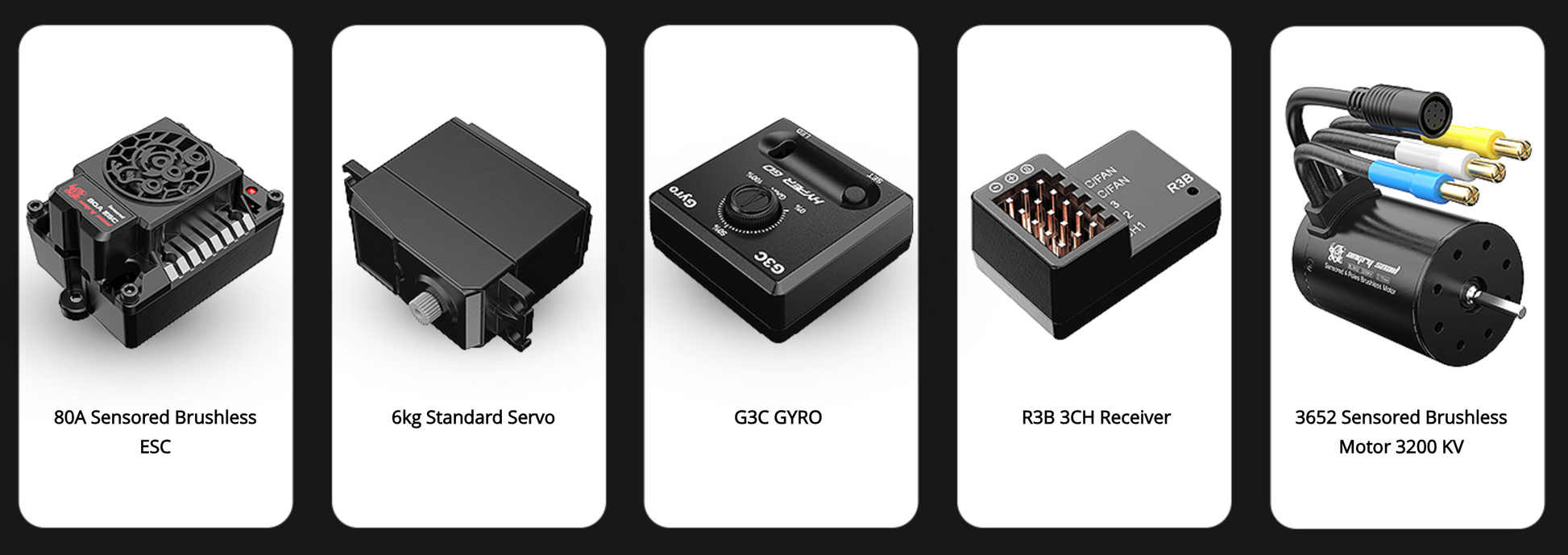 At its heart is an 80A sensored brushless ESC, which pairs with the included sensored 3652 motor for ultra-smooth throttle response, consistent torque delivery and precise low-speed control. The ESC also connects via Bluetooth to a smartphone app, allowing you to adjust punch, drag braking, temperature/voltage monitoring and other functions directly from your phone, a very rare feature at this price point. It also has an adjustable gyro which makes for easy, controlled drifting, that’ll make you feel like a rally god!
